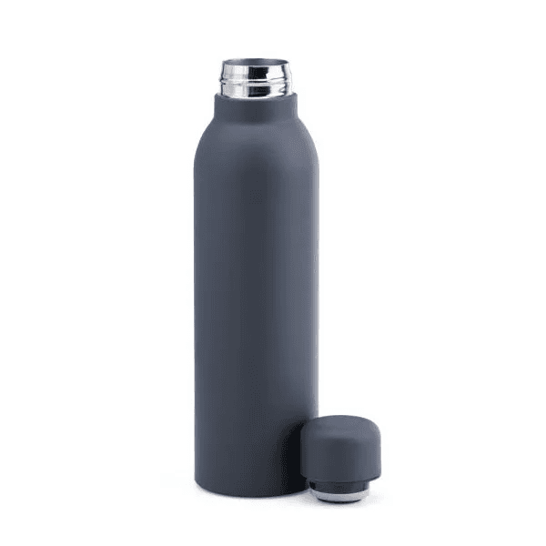 Composto por garrafa cinza em metal Inox, confeccionada com dupla parede em Inox; caderno para anotações cinza com capa dura e caneta roller em alumínio com tampa preta.