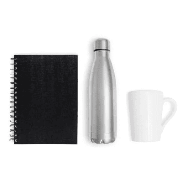 Kit garrafa, caneca e caderno. Composto por garrafa em aço Inox prata com tampa rosqueável; caneca em cerâmica branca e caderno para anotações wire-o preto com capa dura revestida em percalux linho.