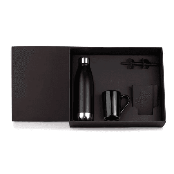 Kit garrafa e acessórios. Composto por garrafa em aço Inox preta com tampa rosqueável; caneca em cerâmica preta; caderno para anotações preto com capa dura e caneta esferográfica em ABS preta.