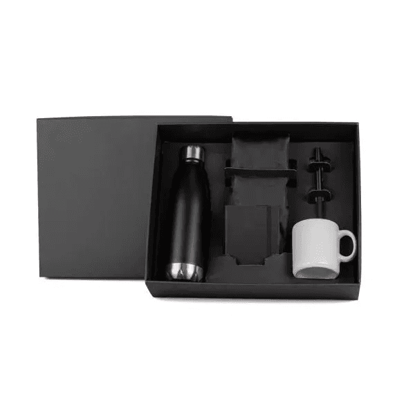 Conta com mochila sacola em nylon, garrafa em aço inox 750ml, caneca em cerâmica, caneta plástica com tampa e ponta touch e caderneta para anotações.