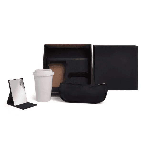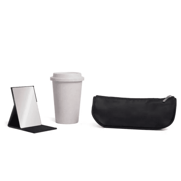 Conta com necessaire confeccionada em microfibra preto com forro em nylon e zíper superior; copo em Fibra de Bambu / PP; espelho portátil com acabamento aveludado preto.