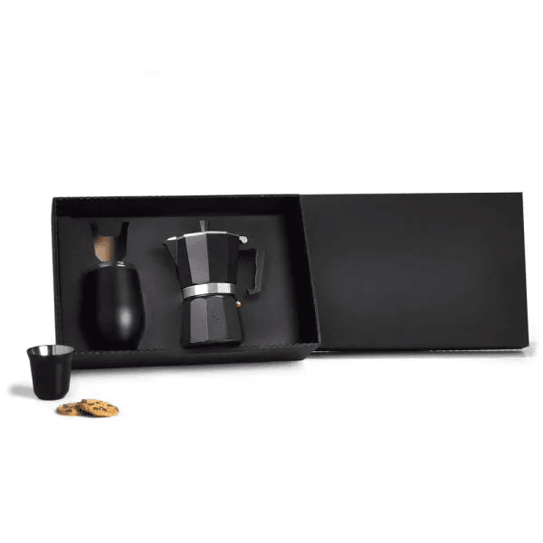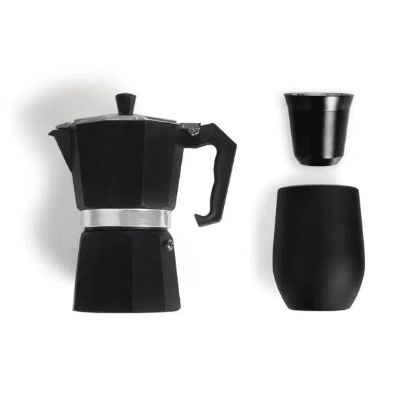 Kit para café. Conta com cafeteira prensa francesa e dois copos para café em aço inox preto, um de 80ml e outro de 340ml com tampa.