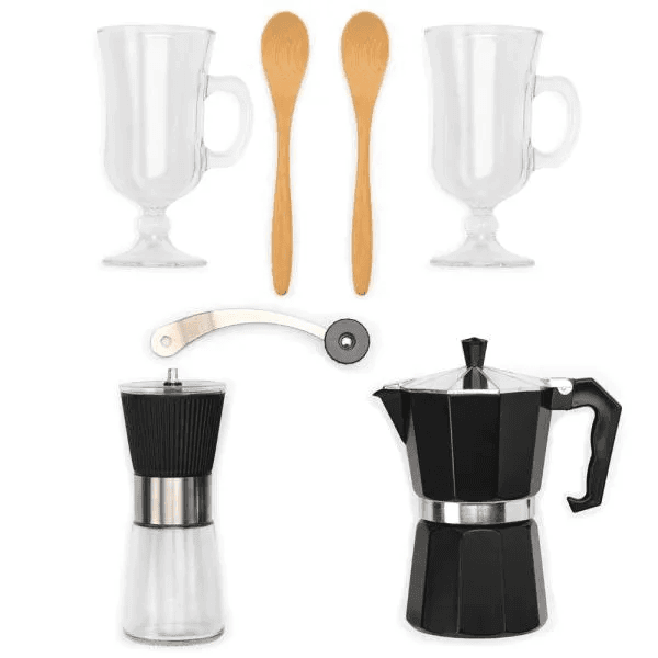 Kit para café. Composto por cafeteira modelo Italiana em alumínio de alta qualidade e resistência; moedor para café confeccionado em vidro e aço Inox; duas canecas de vidro para café com capacidade de 240ml e duas colheres em Bambu de 18 cm.