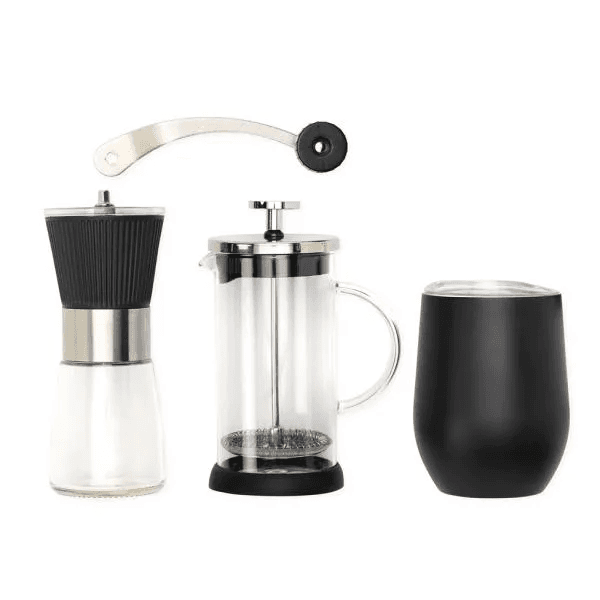 Kit para café com copo térmico. Composto por cafeteira prensa francesa em vidro; moedor para café confeccionado em Vidro/Inox e copo térmico com tampa 340ml, confeccionado com dupla parede de inox, isolada a vácuo.