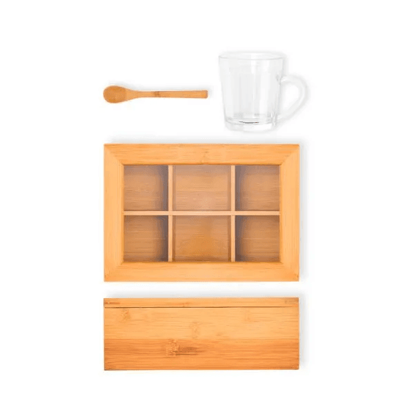Composto por caixa para chá e uma colher de 13 cm em Bambu. Conta também com caneca americano de 270 ml em vidro.