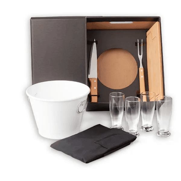 Kit para Churrasco. Composto por tábua em Bambu; faca 7" em Bambu/Inox e garfo em Madeira/Inox; quatro copos em vidro; avental em brim preto e balde para gelo 6L em alumínio branco.