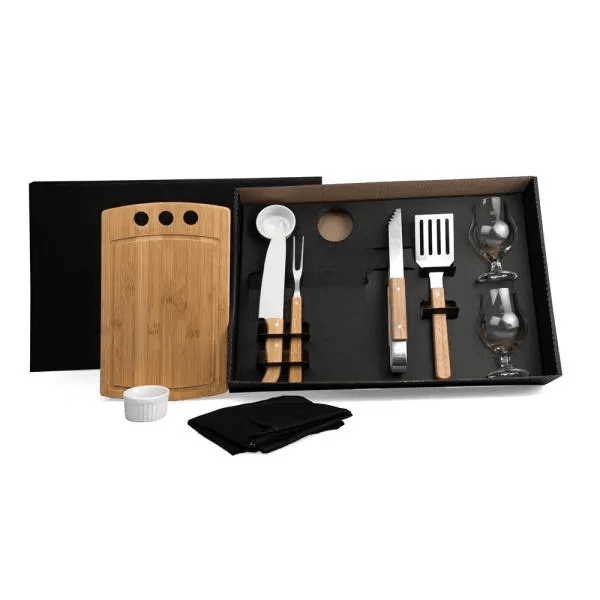 Kit para Churrasco/Hambúrguer/Cerveja. Composto por tábua em Bambu com três furos; garfo trinchante, faca 8", pegador e espátula perfurada em Madeira/Inox; avental em Brim preto; dois ramekins em porcelana e duas taças para Cerveja em vidro.
