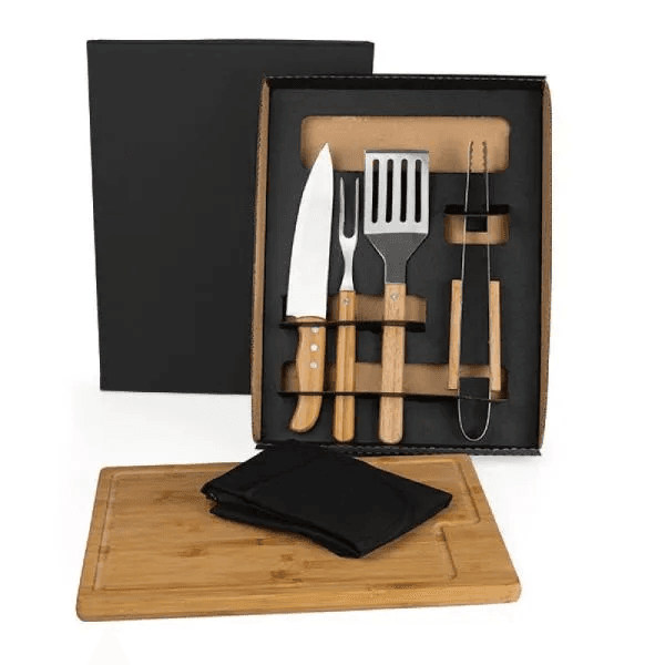Kit para Churrasco/Hambúrguer. Composto por tábua em Bambu; garfo trinchante, faca 8", pegador e espátula perfurada em Madeira/Inox. Acompanha também avental em Brim preto.
