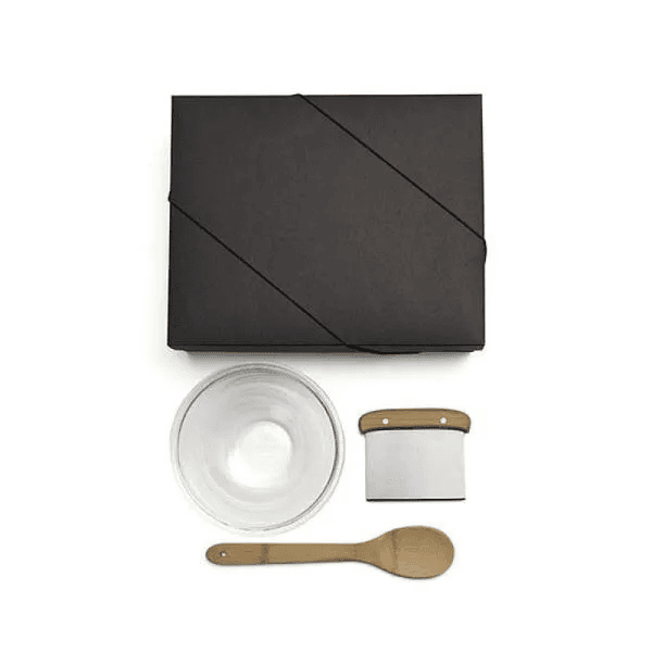 Kit para cozinha. Acompanha colher 30cm em Bambu; Espátula multiuso em bambu/inox e tigela em vidro. Acomodados em uma linda caixa para presente. Rebites em Aço Inox 304, um dos mais resistentes à ferrugem e corrosão.