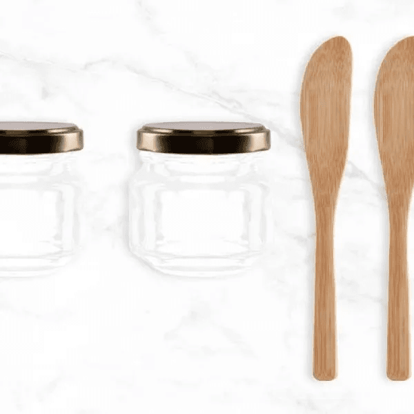Conjunto para patê/geleia. Conta com 2 potes de vidro com tampa e 2 espátulas em bambu.
