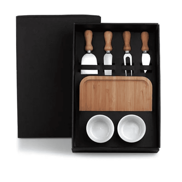 Kit para petisco. Conta com petisqueira em bambu; conjunto para queijo contendo duas facas, sendo uma com ponta e outra reta, uma espátula e um garfo em madeira/inox; conta também com dois ramekins em porcelana.