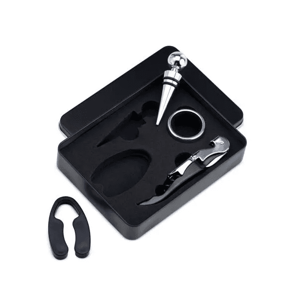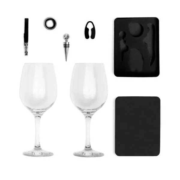 Kit composto por conjunto para vinho composto por 4 peças em Inox, sendo elas um abridor saca-rolhas, tampão para garrafa, anel salva gotas e corta lacres. Acompanha também por duas taças para vinho em vidro.