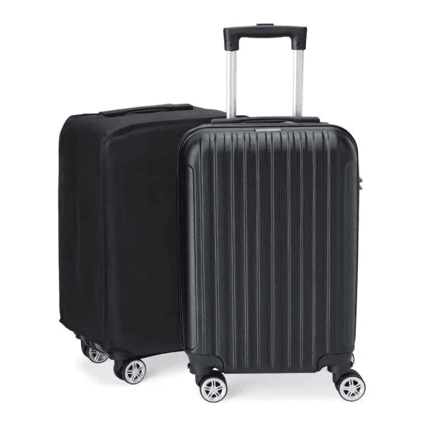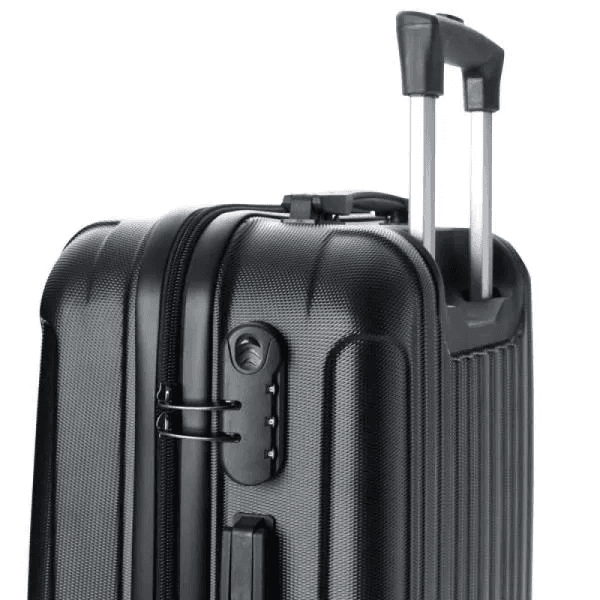 Mala de viagem em ABS rígido preto. Conta com rodinhas 360º, fechamento em zíper e cadeado com senha, alça retrátil de alumínio e duas alças de mão. Parte interna com forro e divisória com zíper. Mala dentro do padrão da ANAC, para viajar a bordo no avião. Acompanha saco de TNT para proteção.