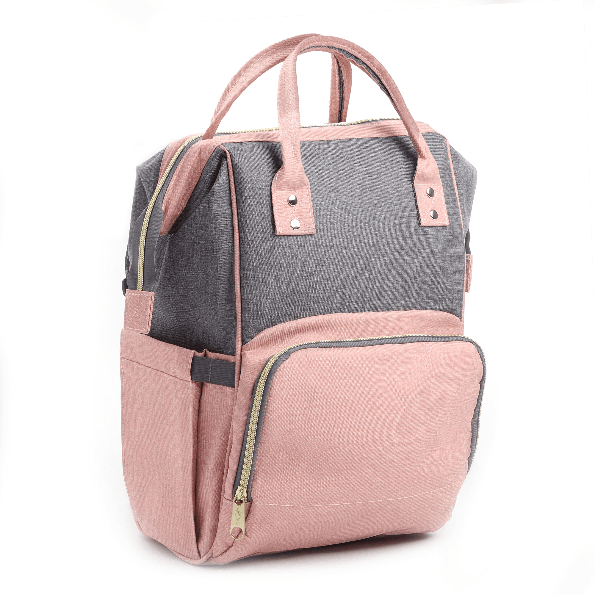 Parte externa: Compartimento com divisórias internas, alça para encaixe para carrinho de bebê, 2 bolsos laterais, bolso frontal com divisórias internas com zíper, alça de mão, compartimento com zíper nas costas da mochila.