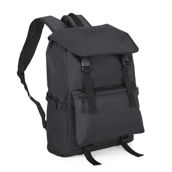 Mochila preta confeccionada em Polyester 600D. Conta com bolso principal com fechamento com cordão e aba com fecho de engate rápido, bolso frontal com ajuste, 2 bolsos laterais com ajuste para controlar o volume da mochila, alças ajustáveis, alça de mão e alça carona para mala. Espaço interno com divisória para notebook com acabamento acolchado.
