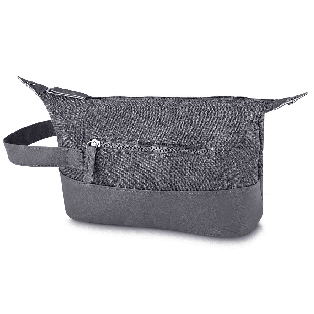 Nécessarie com detalhes em couro sintético, tecido poliéster 600D,alça de mão,bolso externo,botões laterais extensor,gravação Frontal.