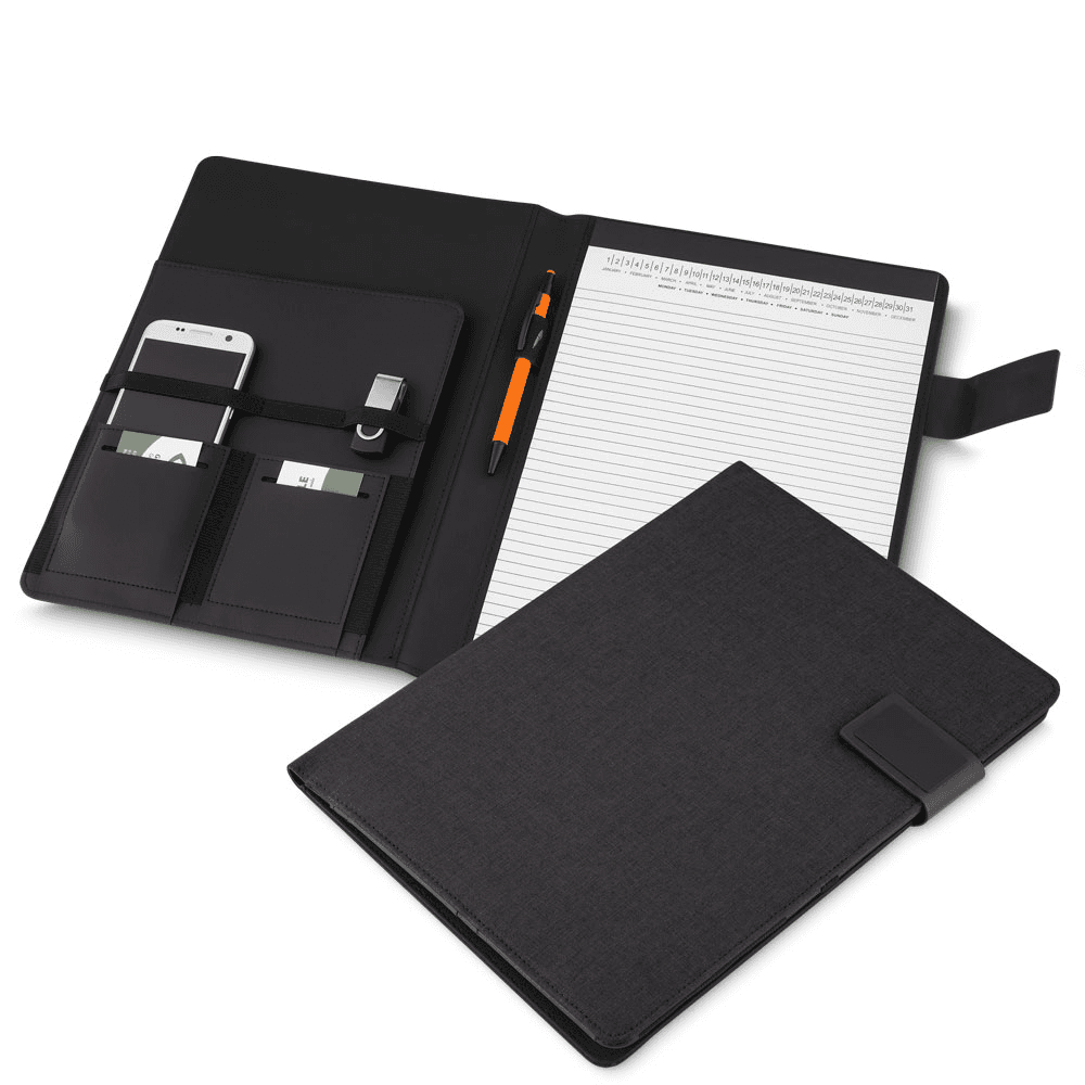 Pasta executiva com bloco de anotações, suporte para celular, caneta, porta cartões, capa com material sintético, 20 folhas (27x21cm) com Fechadura Magnética.