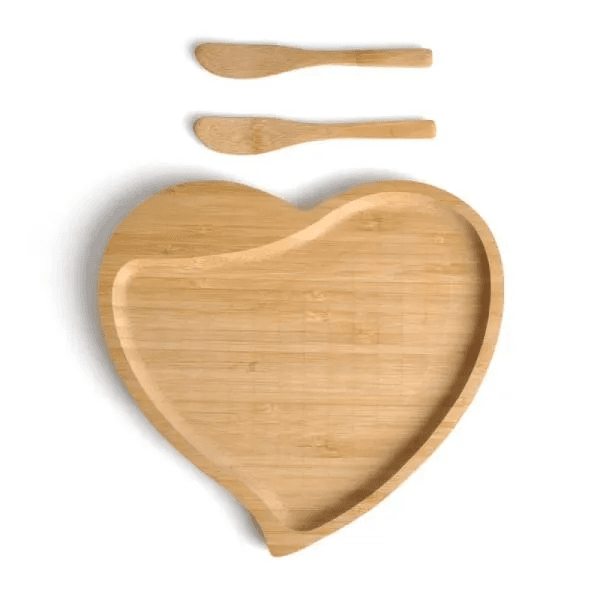 Petisqueira em bambu com formato de coração e duas espátulas de 14 cm.