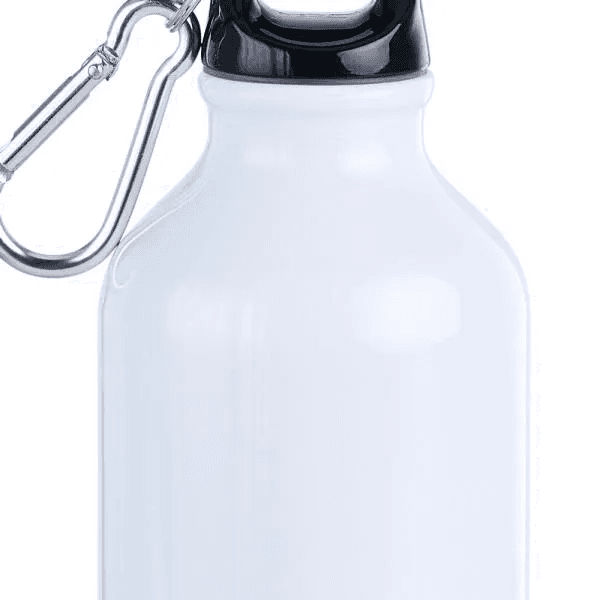 Squeeze branca em alumínio revestido com verniz. Possui tampa em polipropileno rosqueável, argola com mosquetão e anel em silicone para vedação.
