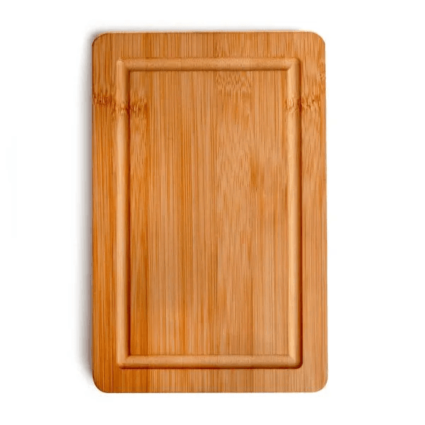 Tábua retangular para queijo em Bambu com sulco ao redor da tábua.