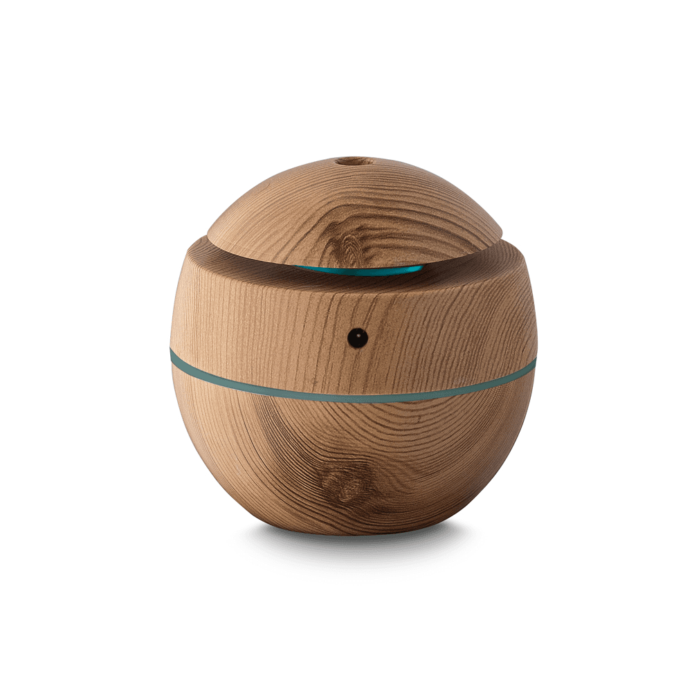 Umidificador de ar com difusor de óleo essencial à base de água via USB. Feito com ABS reciclável+ PP imitando madeira, com capacidade de 120ml. Na parte superior tem um faixa que acende, ideal para uso em escritório ou em casa.