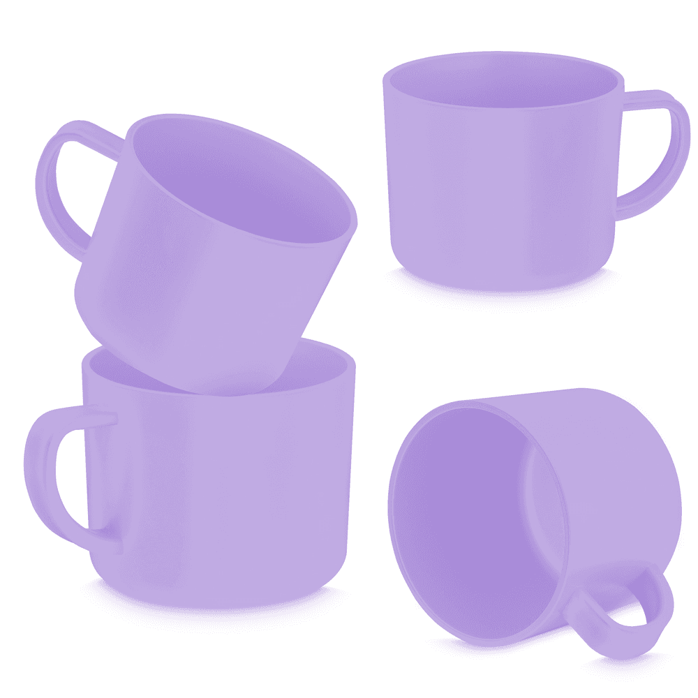 Conjunto com 4 xícaras de plástico RPET da mesma cor, permitindo ir ao microondas, com capacidade de até 200ml.