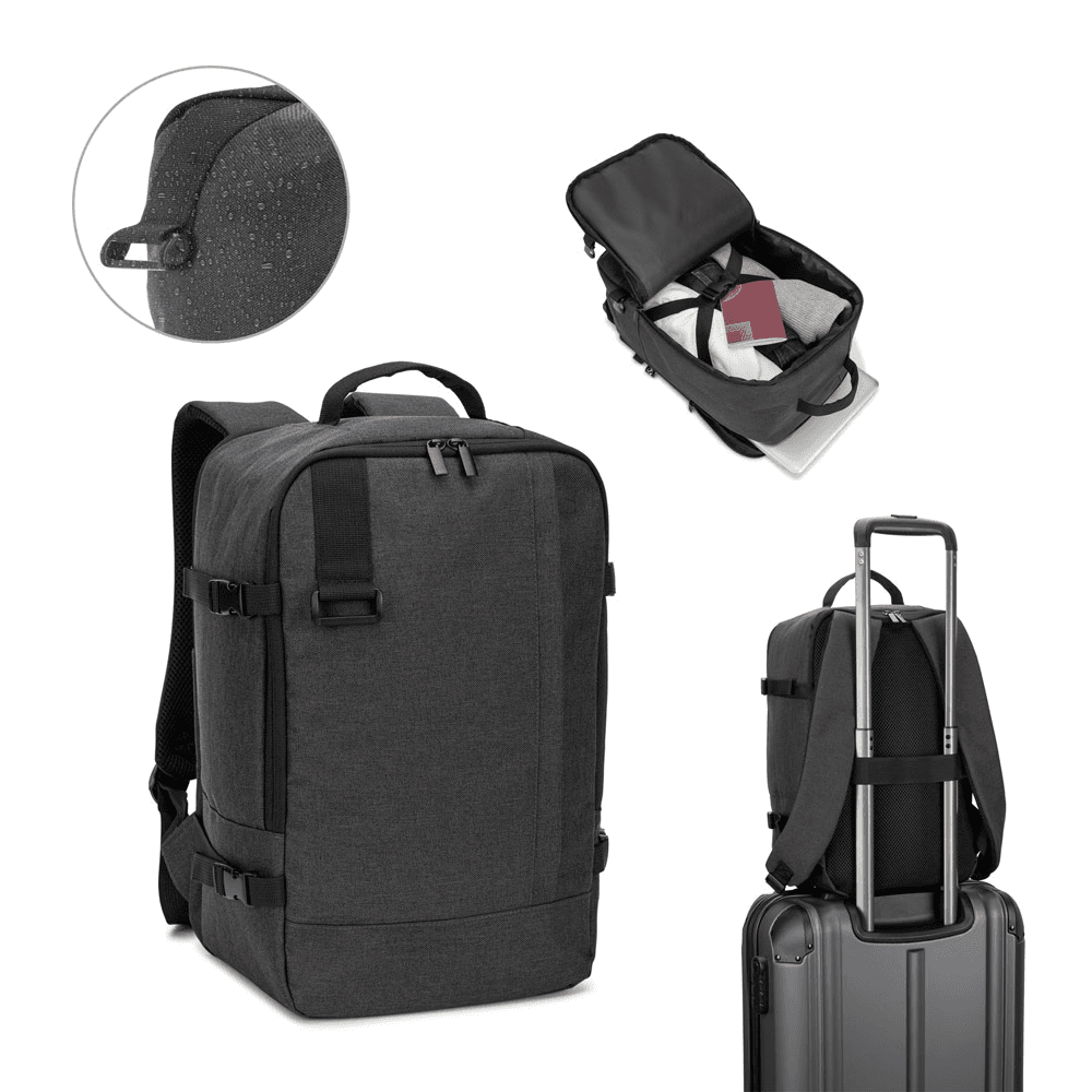 92361 CIES. Mochila desenvolvida para cumprir as dimensões exigidas pelas companhias aéreas em poliéster reciclado 600D de alta densidade com acabamento repelente à água 20 L