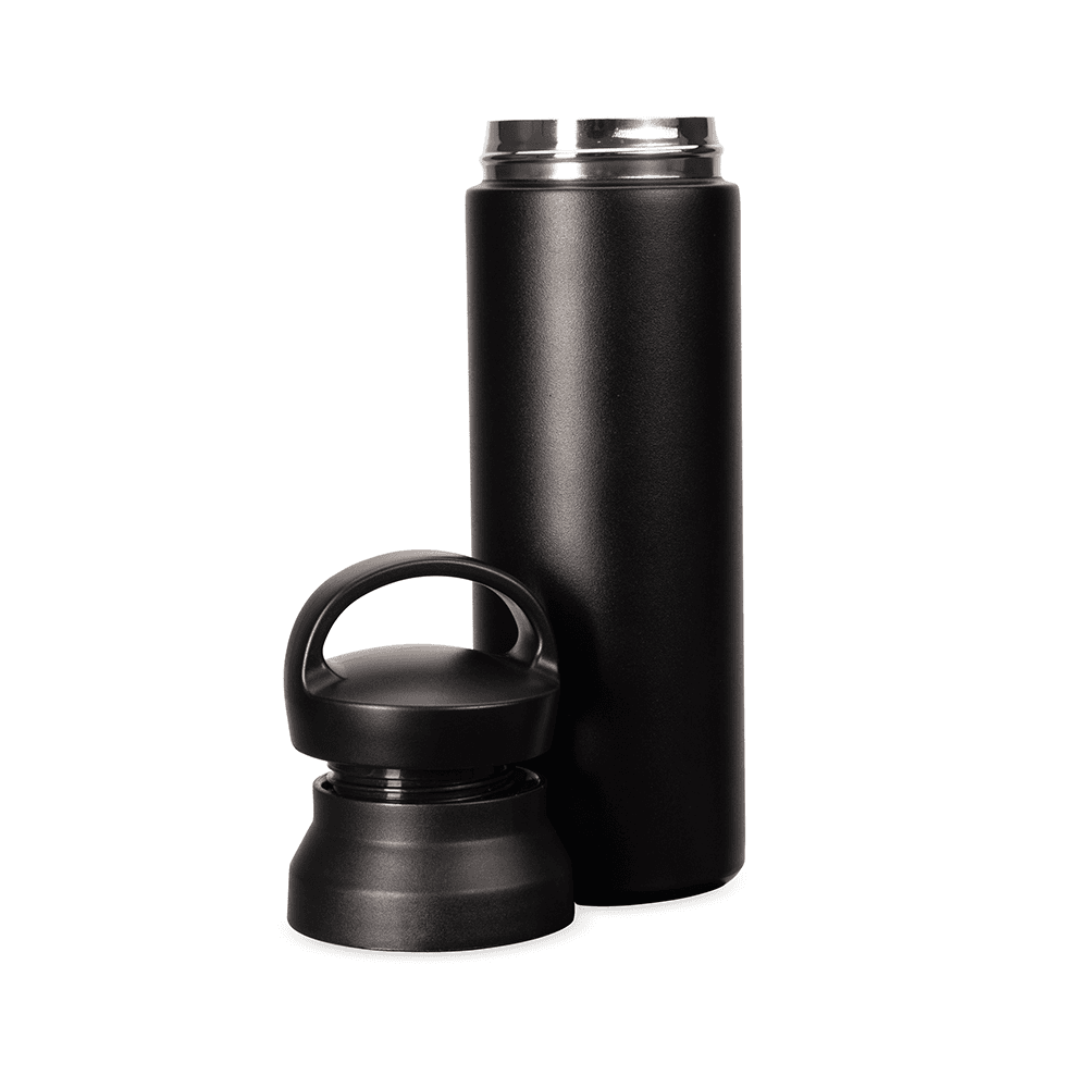 Garrafa térmica com capacidade de até 500ml. Conta com estrutura de parede dupla e isolamento a vácuo, o que permite a conservação da temperatura de bebidas por mais tempo. Possui tampa plástica rosqueável com alça para transporte e abertura em duas camadas.