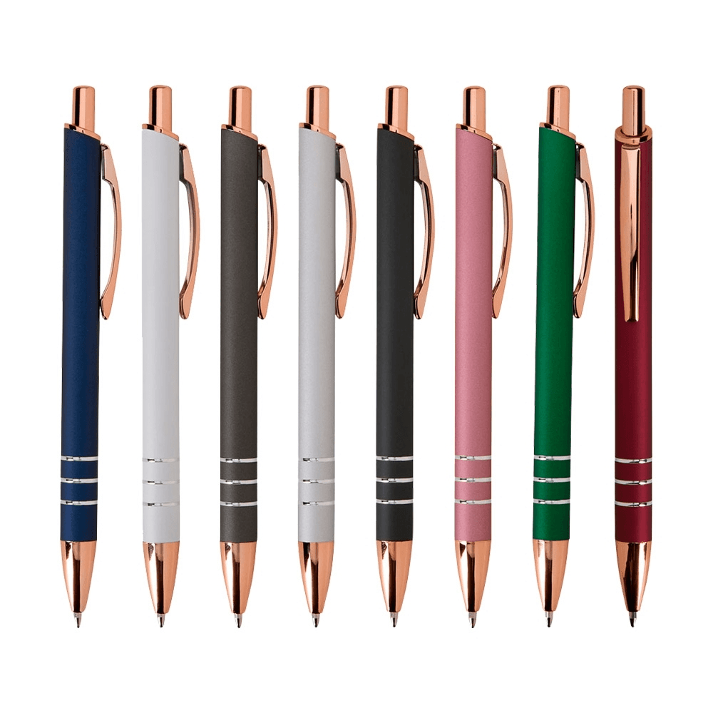 Caneta metálica com acionamento por clique e carga esferográfica azul de 1.0mm, uma combinação que oferece pegada leve para uma escrita mais precisa.