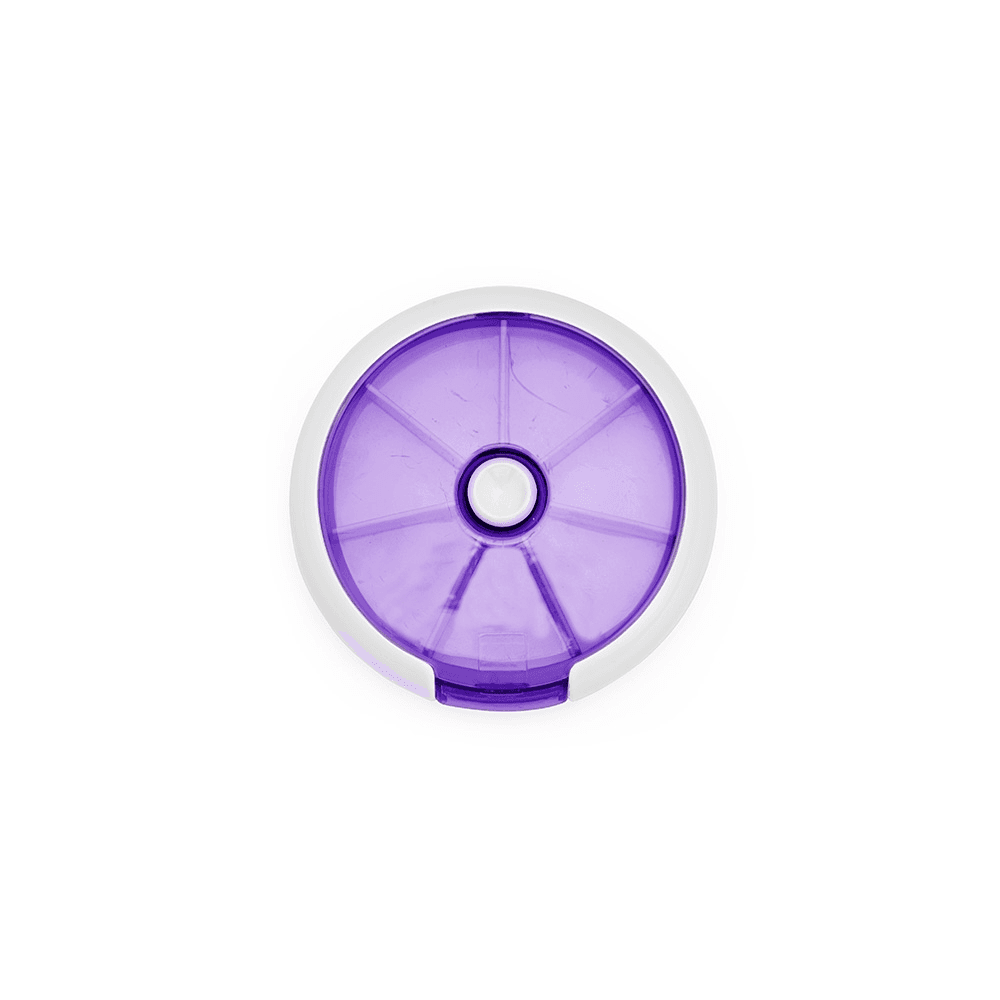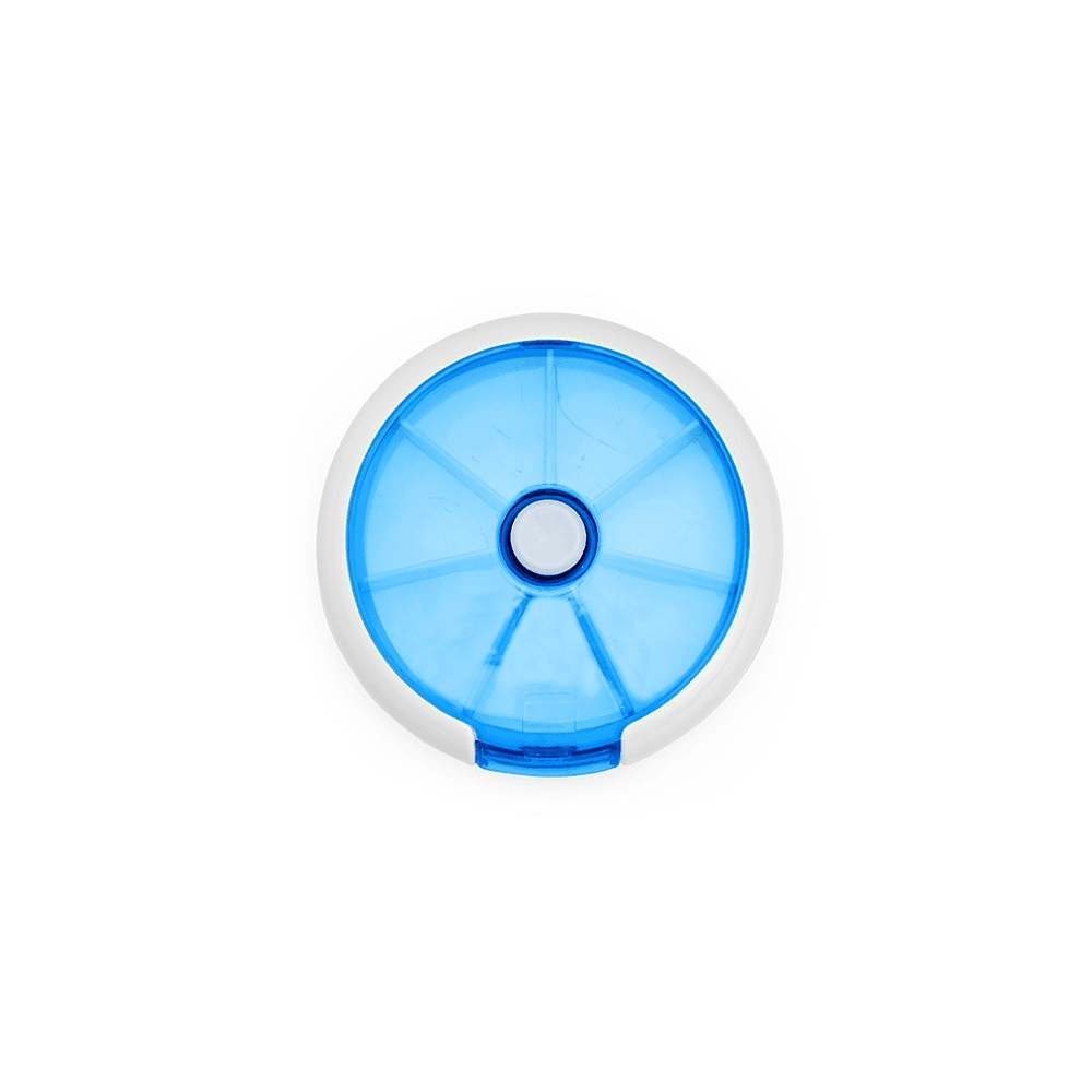 Um porta-comprimidos em plástico com design compacto. Possui sete divisórias e um botão de acionamento que gira um compartimento a cada clique, permitindo o acesso ao conteúdo por meio de uma abertura lateral.