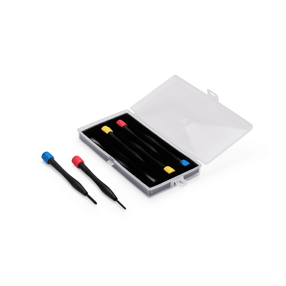 Kit de ferramentas com seis chaves com cabo plástico e pontas metálicas. Contém quatro chaves de fenda e duas chaves Phillips com pontas em tamanhos diferentes. Acompanha estojo plástico com espuma removível para acomodar as peças.