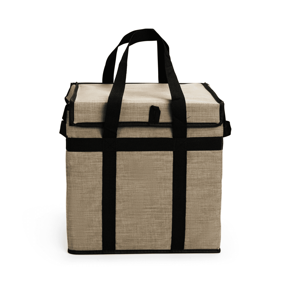 Bolsa térmica confeccionada em Oxford impermeável, fechamento em velcro e capacidade máxima de 31 litros. Conta com armação interna em placa de PVC e junção inferior em velcro, que facilita o transporte quando a bolsa não estiver em uso. Possui revestimento térmico interno em folha de alumínio e um par de alças de nylon para transporte.