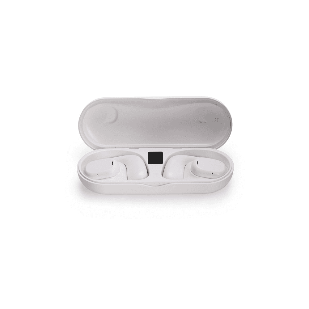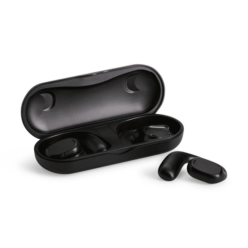 Fones de ouvido sem fio com estrutura em plástico. Possuem formato aberto e ergonômico, permitindo o encaixe nas orelhas sem entrar em contato direto com o canal auditivo. Apresenta conexão via Bluetooth 5.3 que oferece uma transmissão de dados mais estável e com maior qualidade. Acompanha estojo de carregamento com visor de percentual da carga total, além de cabo USB-C para recarga.