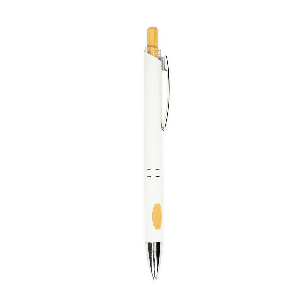 Caneta metálica com detalhes emborrachados no corpo, acionamento por clique com parte superior em bambu, carga esferográfica azul de 1.0mm, o que proporciona uma pegada leve e uma escrita precisa.