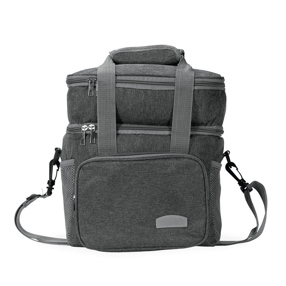 Bolsa térmica em Oxford resistente à água e capacidade máxima de 15 litros. Possui revestimento interno em PEVA, ideal para conservar a temperatura de alimentos e bebidas por mais tempo. Sua tampa apresenta revestimento térmico em folha de alumínio. Além disso, possui compartimento frontal externo e mais dois bolsos laterais em tela de nylon com elástico. Apresenta alças de mão com suporte de juntura e alça transversal removível.