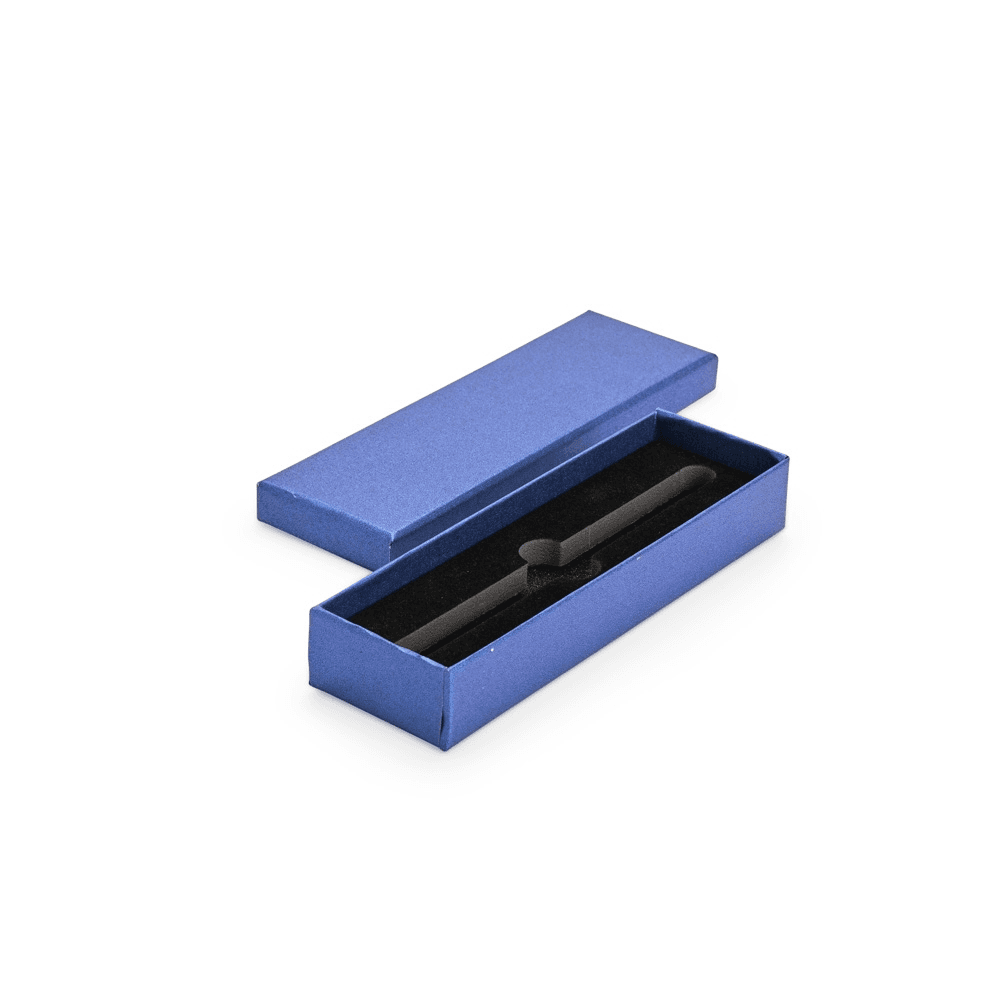 Estojo em papelão e revestimento removível de duas camadas em espuma com espaço para guardar uma caneta ou lapiseira.