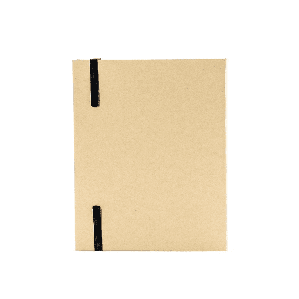 Bloco de anotações com capa dura em kraft e fechamento por elástico. Possui aproximadamente 80 folhas de tonalidade marfim sem pautas e cinco canetas coloridas de ponta dupla: uma fina e outra tipo pincel.