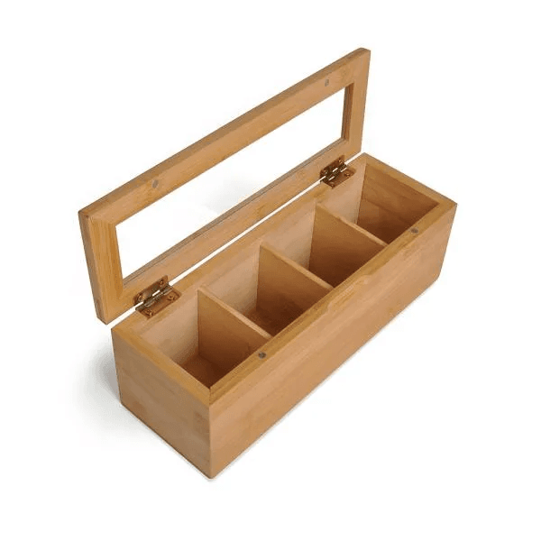 Caixa para chás em Bambu/Poliestireno. Possui 4 divisões, tampa com visor em Poliestireno e fecho com imã. Não acompanha chás.