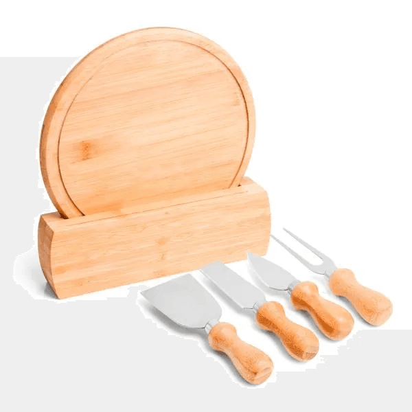Kit para queijo. Conta com tábua redonda e suporte em bambu; duas facas, uma espátula e um garfo para Queijos em madeira/inox. Tábua confeccionada com tripla camada invertida, para dar maior durabilidade e não deformar com o passar do tempo.