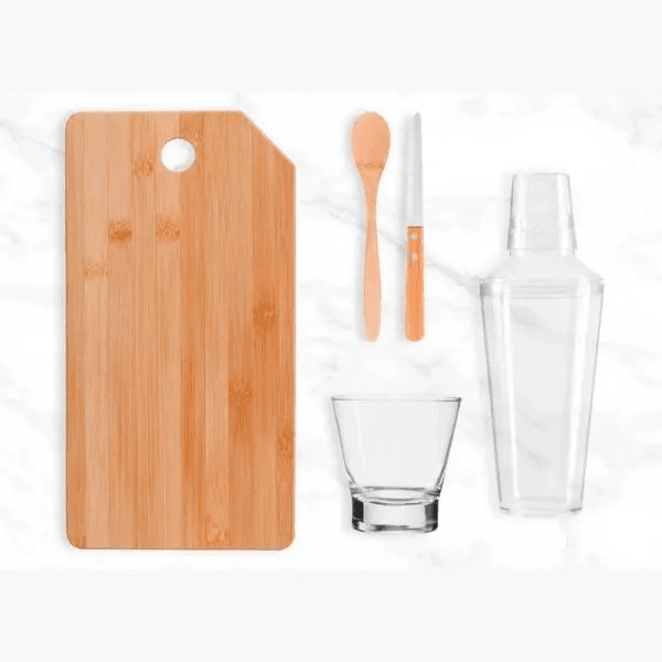Kit para Caipirinha e Drink com coqueteleira em plástico PS; tábua e colher 18cm em Bambu; faca 4" para frutas em Madeira/Inox; copo em vidro. Coqueteleira livre de BPA - bisfenol. A (substância química prejudicial a saúde e encontrada em plásticos). Estão perfeitamente acomodados em uma caixa para presentear.