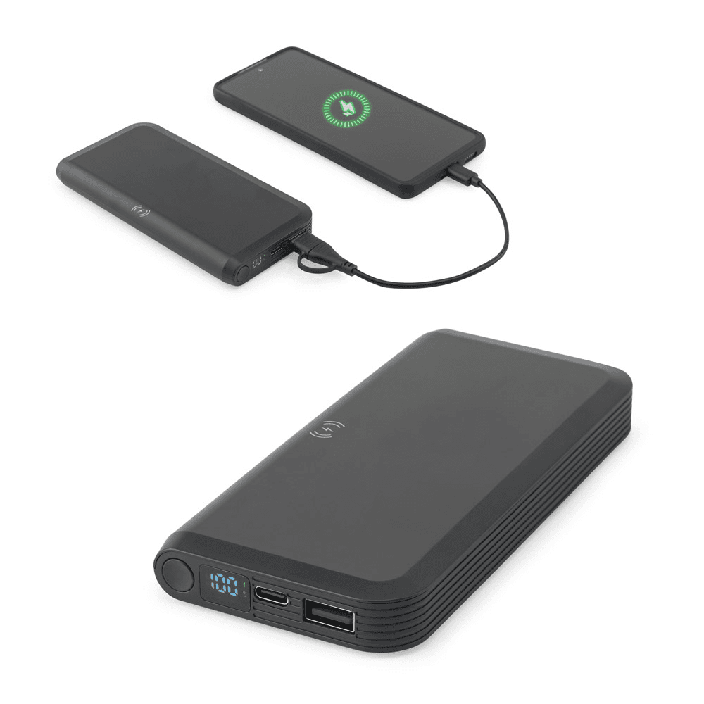 97214 BECKER 10. Bateria portátil em ABS 100% reciclado com carregador por indução (wireless) super-rápido 15W e capacidade de 10.000 mAh